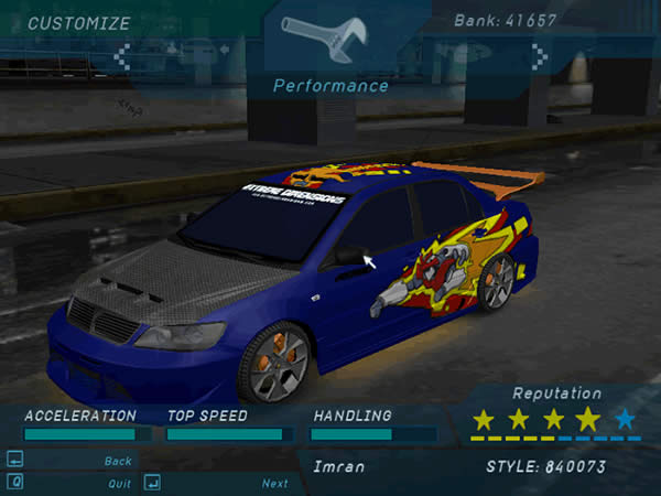 Almost all of my friends know that I'm no car freak. Well, recently, I've been playing a few racing games (GT3, NFS, Rally etc). I bought NFS Underground around 2 weeks ago. NFS isn't as tough as GT3, because GT3 controls and maneuvers are much more realistic. Anyways, check out my car in Underground.